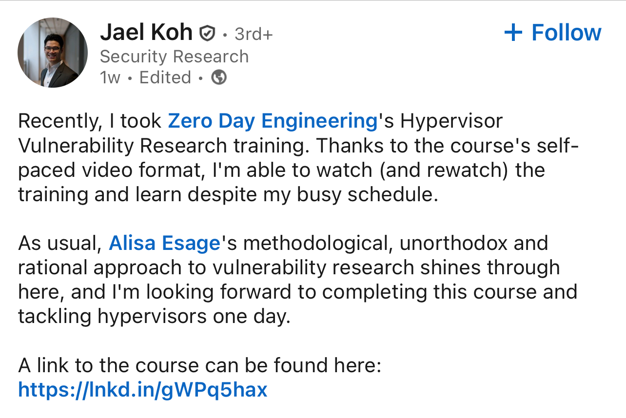 Alisa's training completely changed my mindset and the way I was looking at hypervisors. I highly recommend the Advanced Hypervisor Exploitation training. Actually, if you're interested in hypervisors it's mandatory.