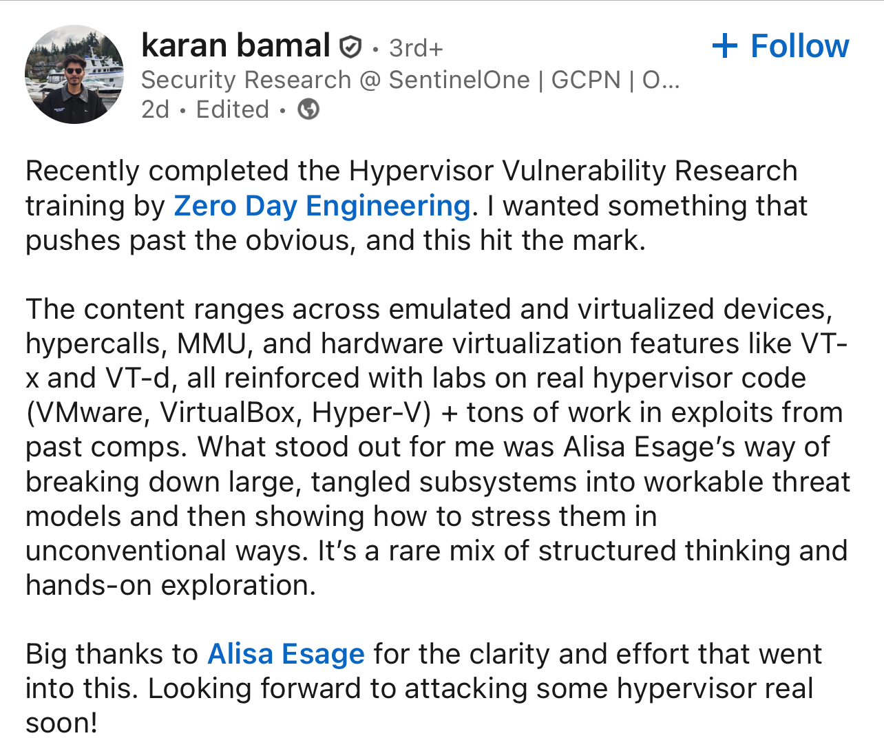 Alisa's training completely changed my mindset and the way I was looking at hypervisors. I highly recommend the Advanced Hypervisor Exploitation training. Actually, if you're interested in hypervisors it's mandatory.