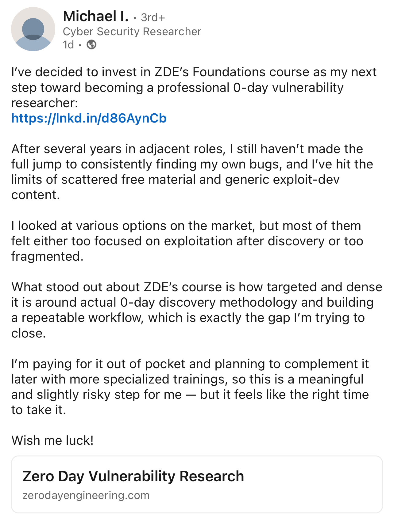I just finished my first round of Zero Day Vulnerability Research training https://t.co/B2nAFXysp3 from @zerodaytraining. It is exceptional for its beginner-friendly approach, comprehensive and easy-to-digest structure, and practical application of concepts. It provides valuable insights into vulnerability research, foundational theory, and skills necessary for further specialization. From day one, the training sets a solid foundation by introducing abstract models, essential theories, and the mindset required to become an effective zero-day engineer. One of the key strengths of this course is its structure, which seamlessly integrates theoretical lessons with practical exercises. The inclusion of real-life case studies and security vulnerabilities discovered by the author adds immense value, making the learning experience engaging and informative. I plan on revisiting the training to absorb its comprehensive content more thoroughly.