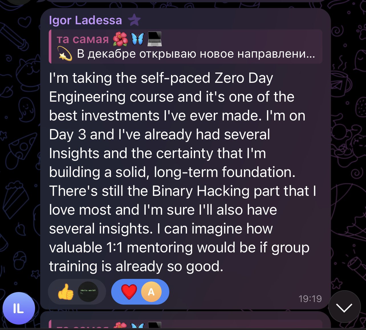 @alisaesage Thank you again @alisaesage for the outstanding course, it was excellent! I can only recommend anybody who want to discover or to perfection their skills to look at @zerodaytraining courses!