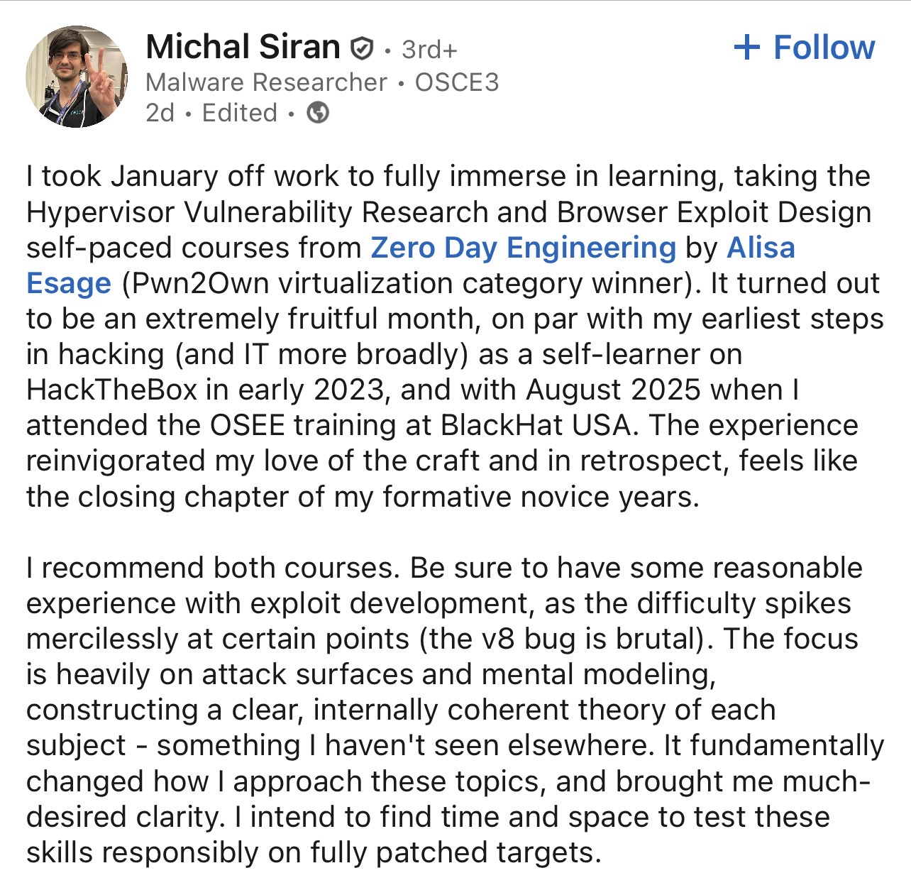 The Zero Day Vulnerability Research training from @zerodaytraining led by the incredibly insightful Alisa Esage was a game-changer for me. This four-day comprehensive education proved to be an incredible experience, combining more than a decade of research insights into vulnerability with hands-on practical applications of real-world case studies. Alisa's approach to teaching, emphasizing on the development of the right mindset and cognitive skills necessary for vulnerability research, truly sets this course apart. It’s not just about understanding a specific attack; it’s a deep dive into the essentials of vulnerability research, from memory corruption and logic bugs to navigating complex codebases and the nuances of modern software. What stood out to me was the practical tips from Alisa's own Pwn2Own experiences. The course doesn't just feed you the information; it challenges you to engage actively with the content, encouraging a researcher's mindset that's crucial for anyone serious about delving into VR. Whether you're coming from a software development background or other security related field, this course is invaluable. It not only provides a well-structured self-learning approach but also encourages for continuous improvement of key concepts in vulnerability research. Highly recommended for those interested in vulnerability research.